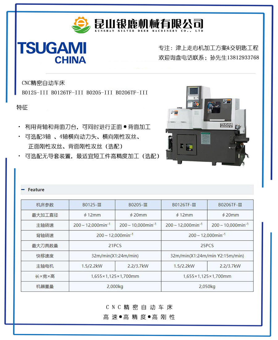 津上B0125和B0205共用床身、這款機一般情況下我們不賣:如果加工7mm以上產品我們建議買B0205-III價格差別不大、可加工范圍小。我們在針對1-3mm產品時會推薦用這款機、搭配冠通小料機使用。可以選擇配導套、側面動力刀頭、背軸、功能和B0205相當,同樣可以實現主背軸同步加工、互不干擾。