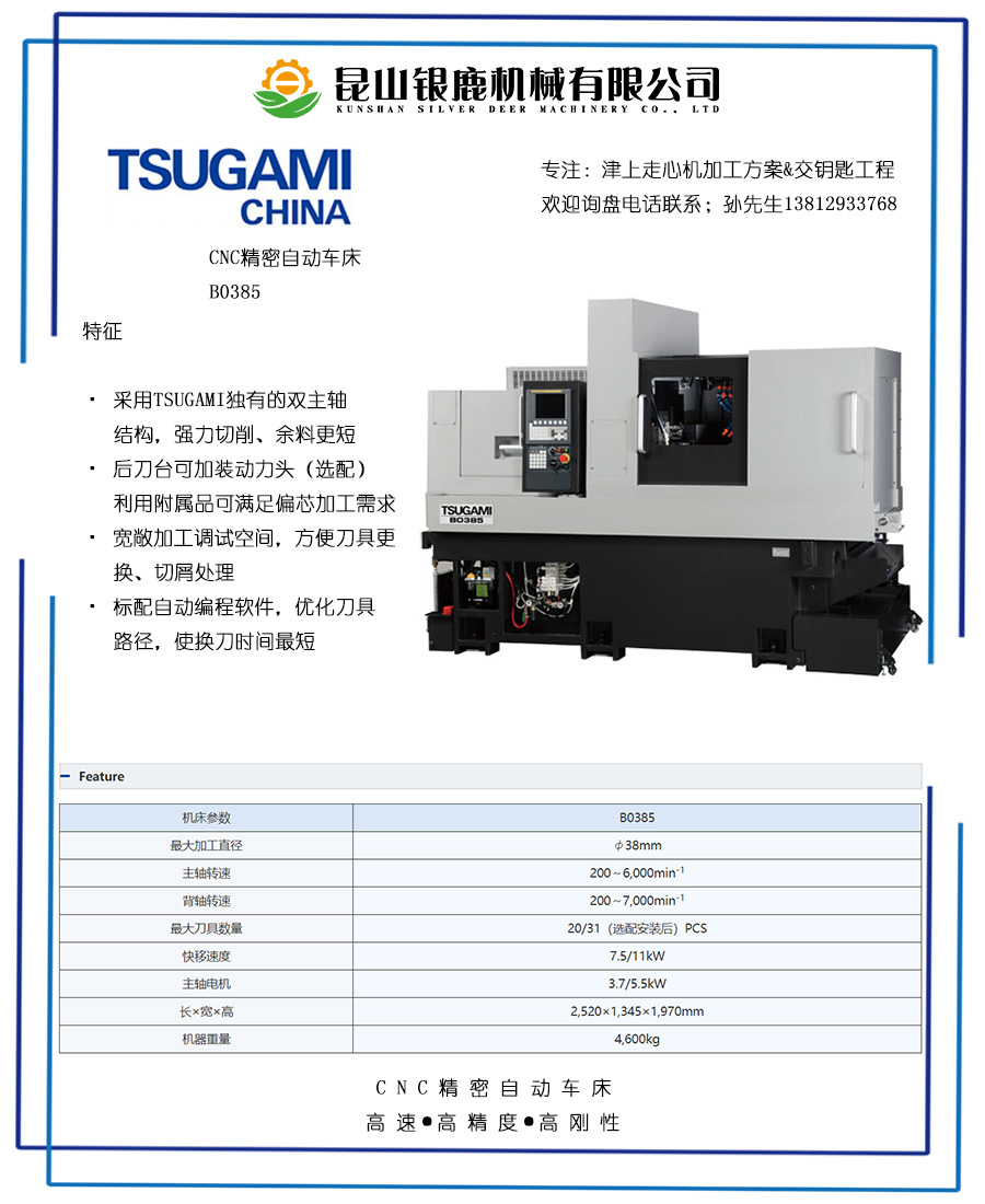 津上目前在產最大直徑之走心機,適用直徑8-38mm,主軸7.5-11KW電機,背軸3.7/5.5KW,配套剛性高。對長軸類大直徑產品實現自動化批量加工。機床整體重達4600kg;比較專業細節的部分,面談。